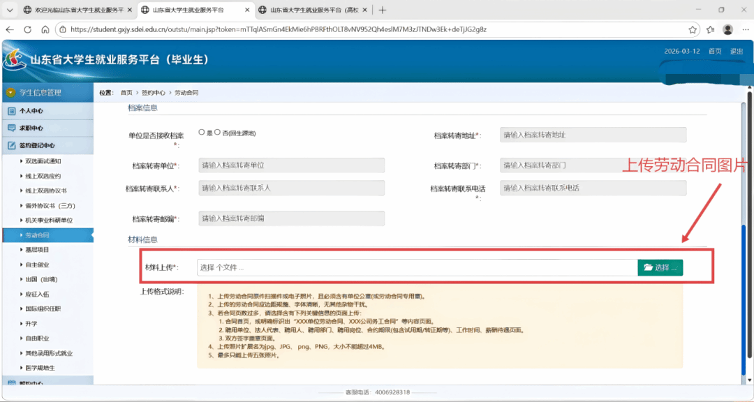 最后请上传劳动合同图片。(上传前图片重命名,不要一长串字符命名,每张图片大小不能超过4M)